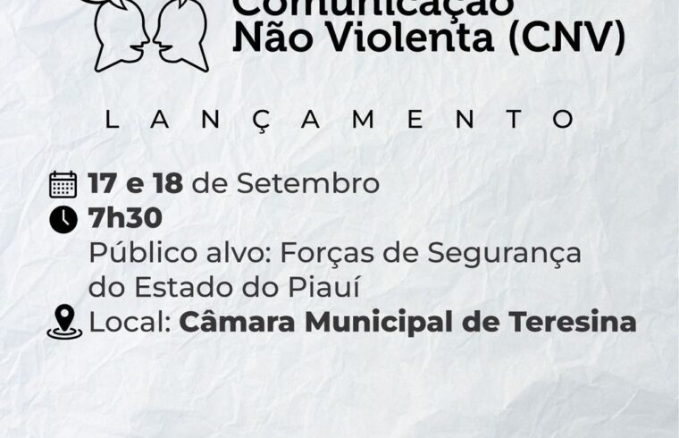 A Secretaria da Segurança Pública do Piauí, por meio da Superintendência de Cidadania e Defesa Social, em parceria com a Diretoria de Gente e Planejamento e a Diretoria do Sistema Único de Segurança Pública (SUSP-PI), promove, nos dias 17 e 18 de setembro, o curso de Comunicação Não-Violenta (CNV) e técnicas de mediação de conflitos. O evento ocorrerá na Câmara Municipal de Teresina, localizada na avenida Marechal Castelo Branco, nº 625, bairro Cabral, com início às 7h30.
